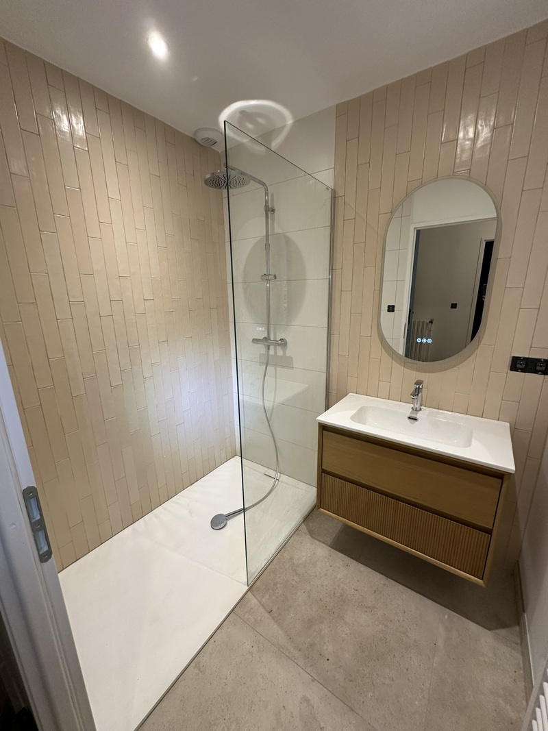 • Création d’une salle de bain moderne avec douche extra-plate et meuble suspendu